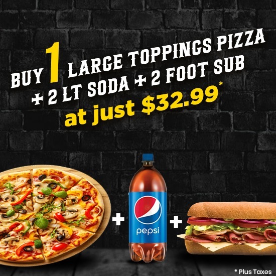 BUY 1 LARGE TOPPING PIZZA +2 LT SODA+2 FOOT SUB $32.99+TAX